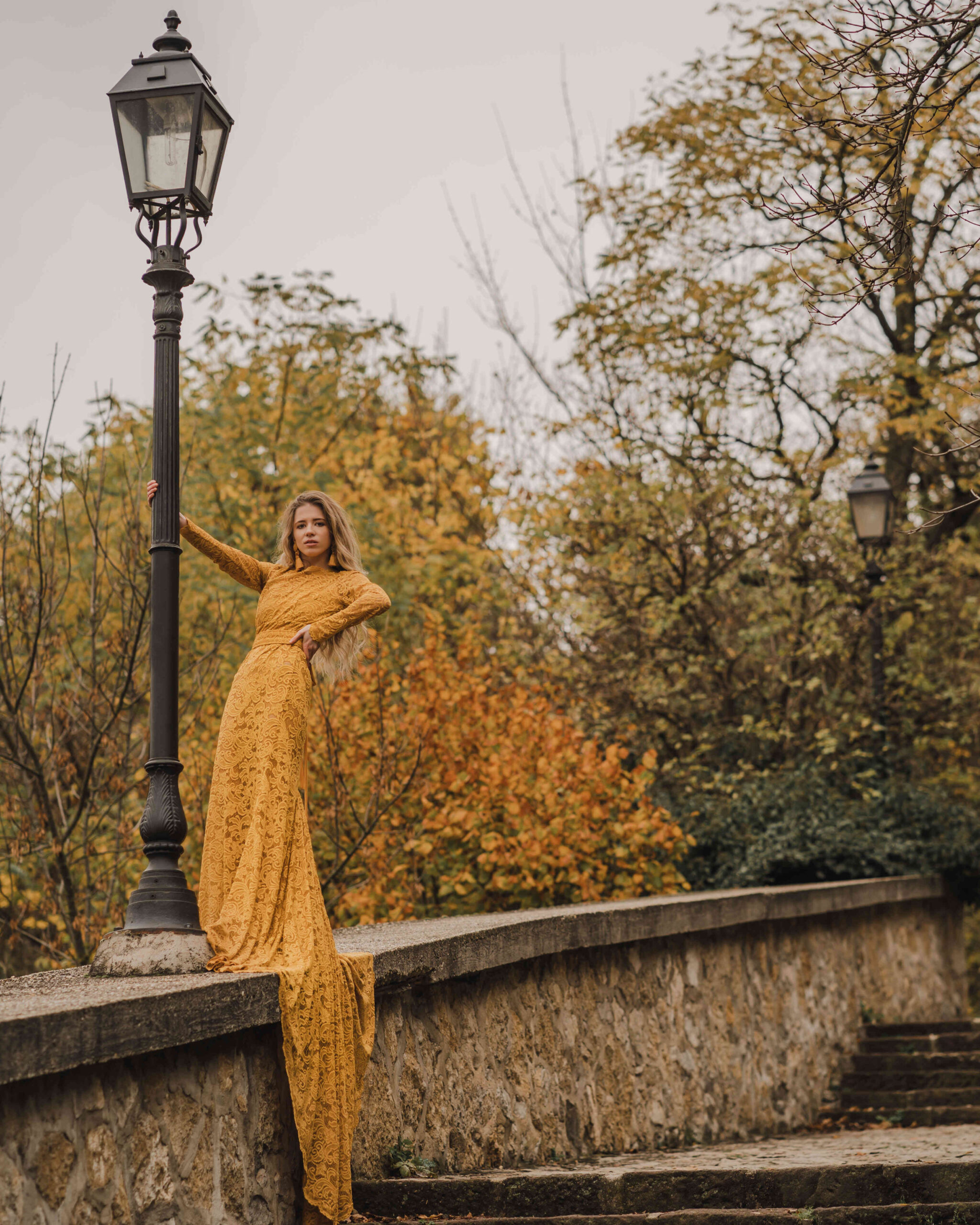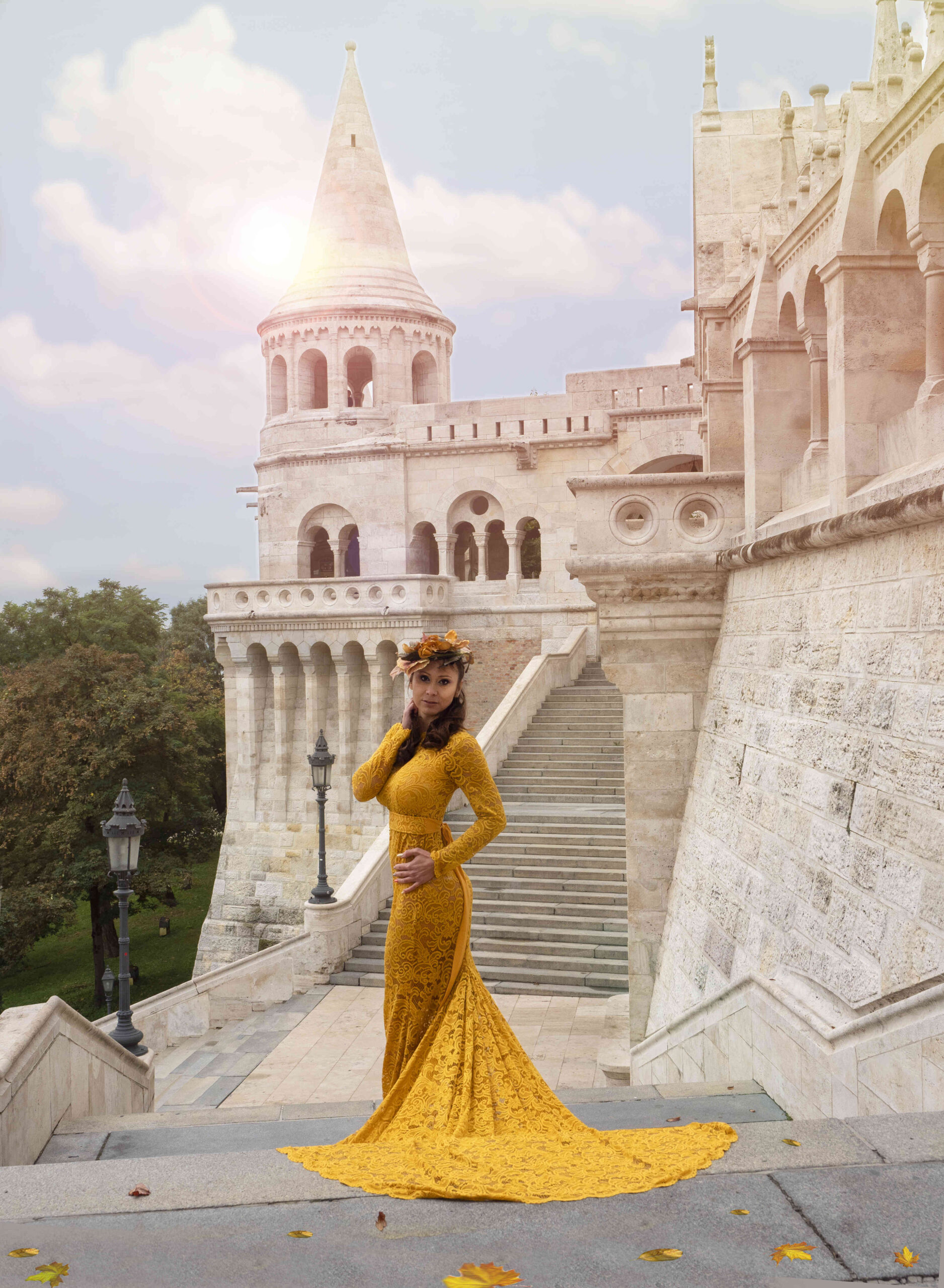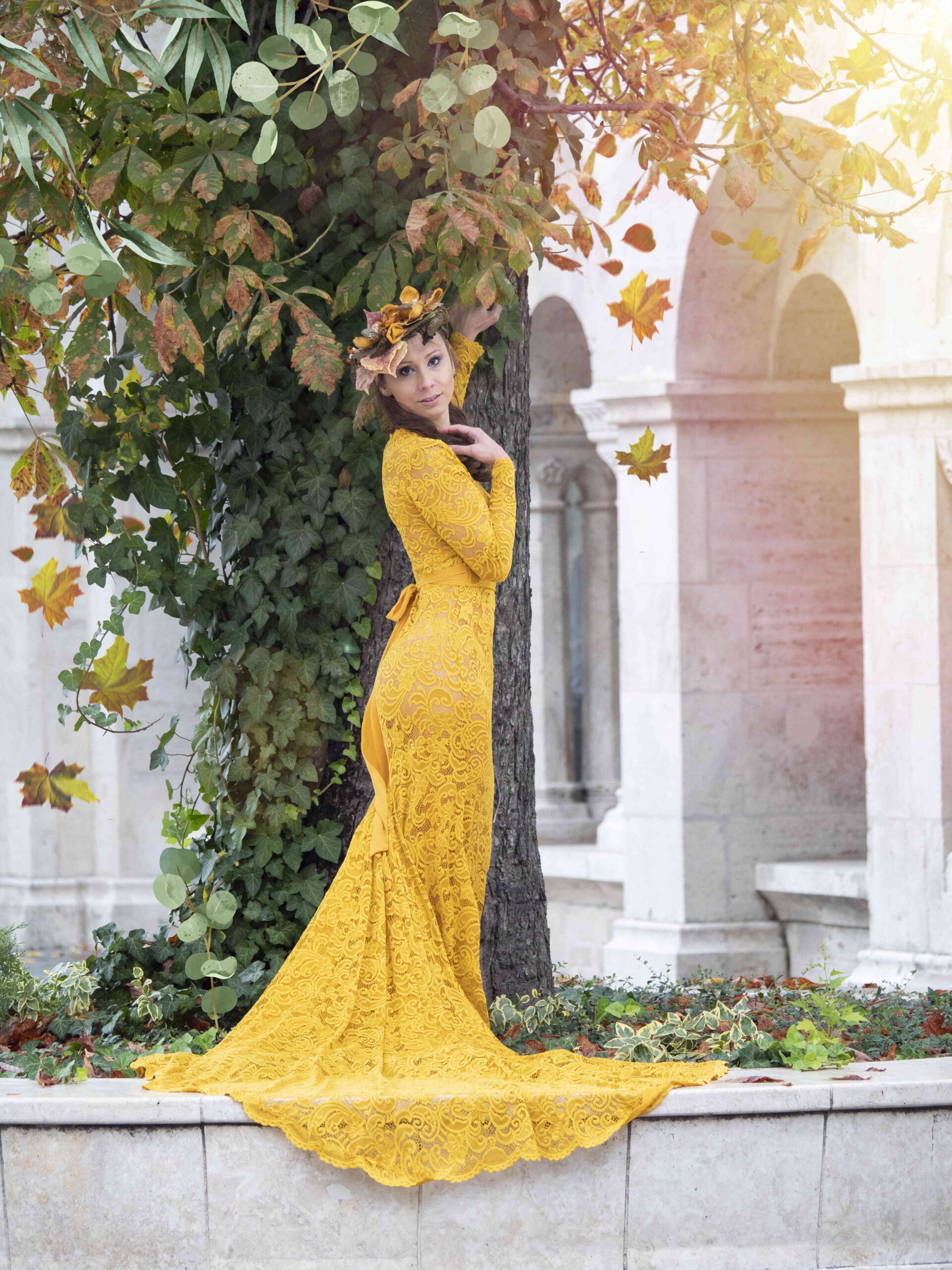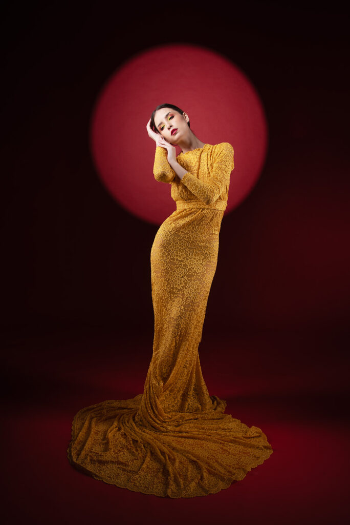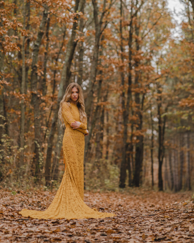 The Allure of Lace dress exudes elegance and style, making it the perfect choice for photoshoots. Its stunning lace material is slightly transparent, adding a romantic touch to your look. The closed neckline and long sleeves create graceful lines, while the flexible design ensures comfort during your photography session. The belted waist accentuates the silhouette, and the train adds a touch of sophistication, ensuring that every step you take is captivating in front of the camera.