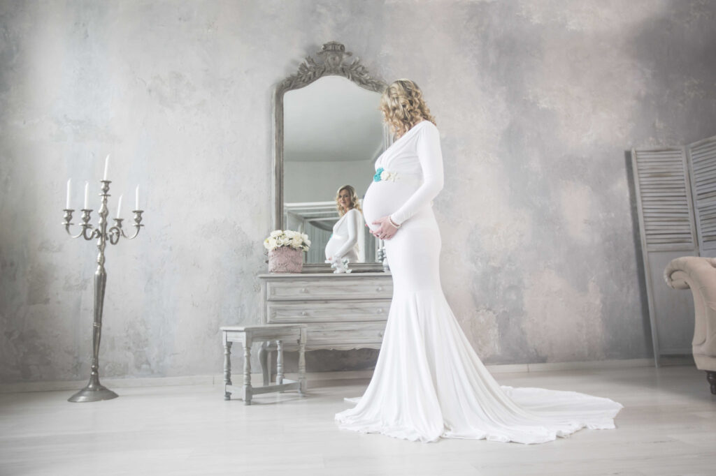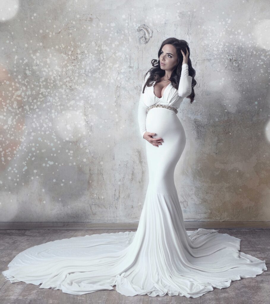 This mermaid-style dress, crafted from stretchy jersey fabric, embodies a refined and understated elegance, making it perfect for studio photoshoots. The deep neckline accentuates the neck and bust, while the delicate tie under the bust, made from the same fabric, gently shapes the figure. The dress is form-fitting down to the knees, where it flares into a sweeping hemline that can be dramatically spread out, creating a captivating effect in motion and photographs. The long sleeves add a touch of sophistication, making this dress the ideal choice for a graceful yet striking look.