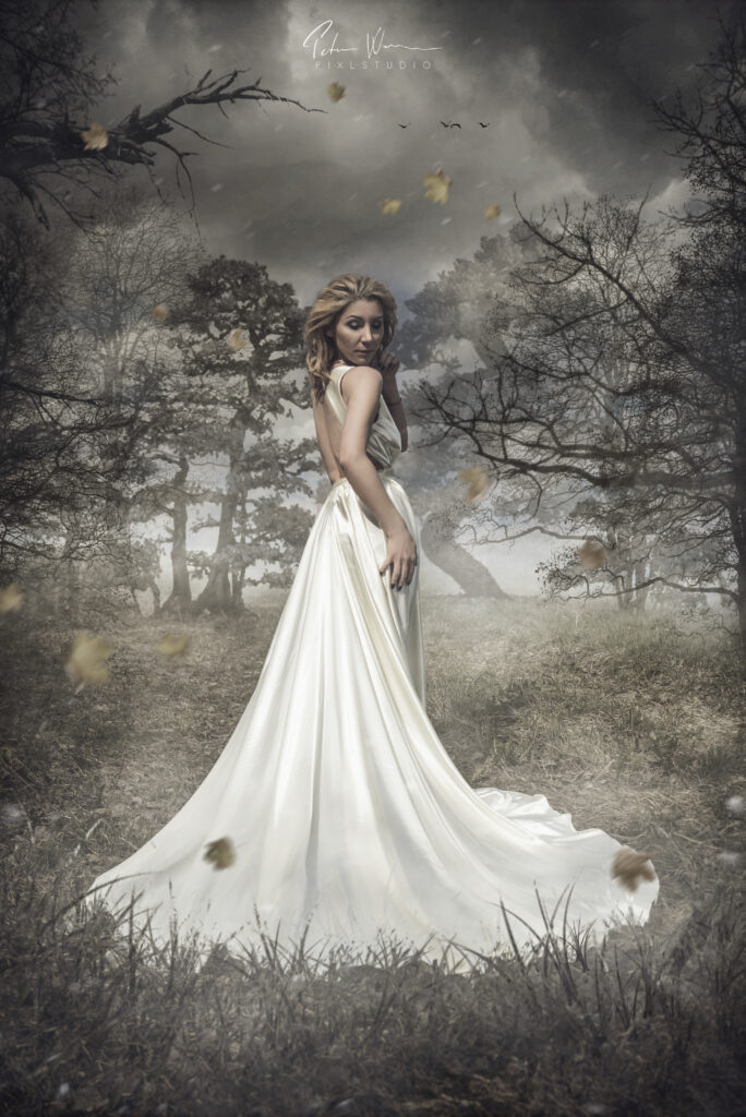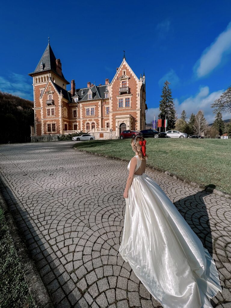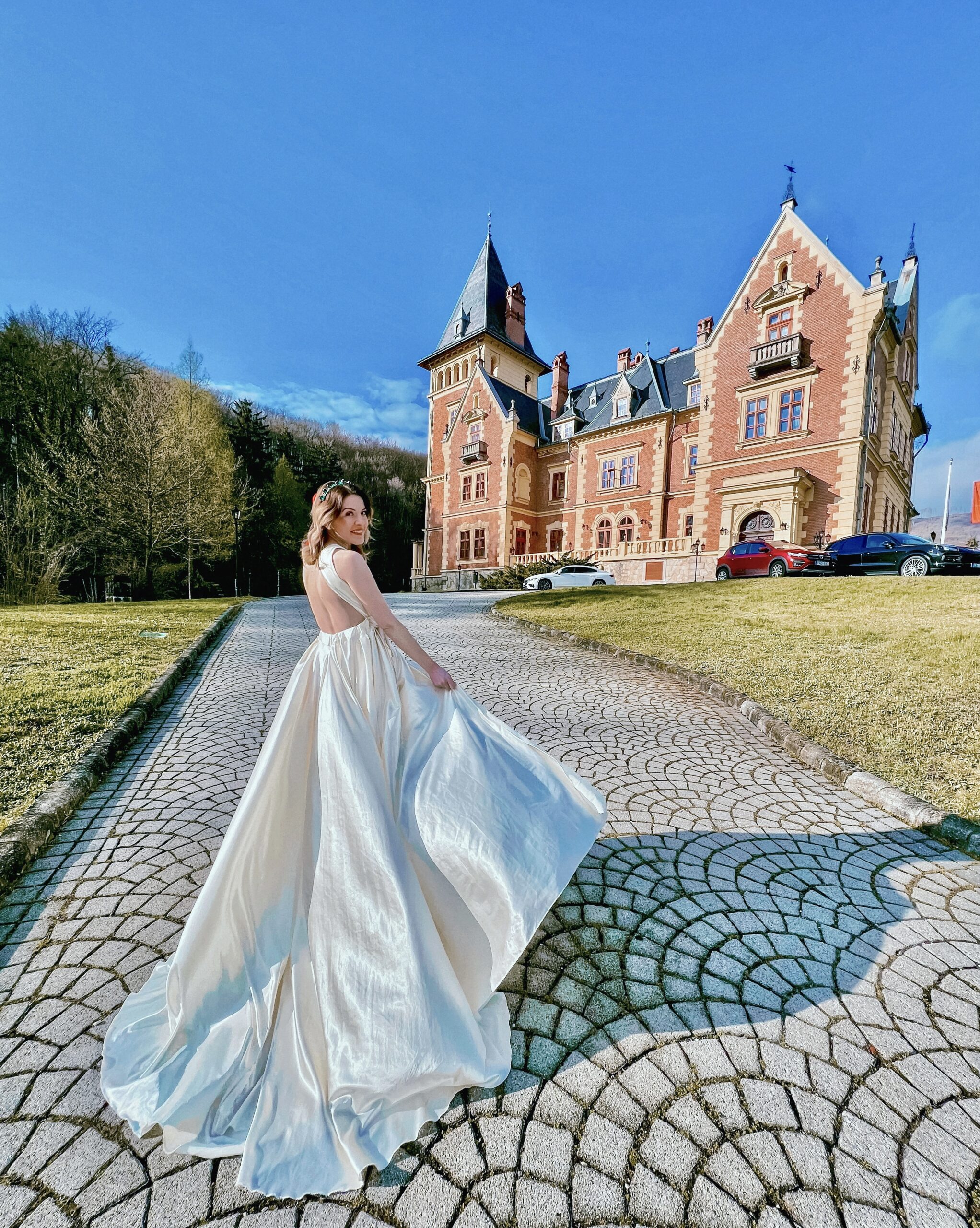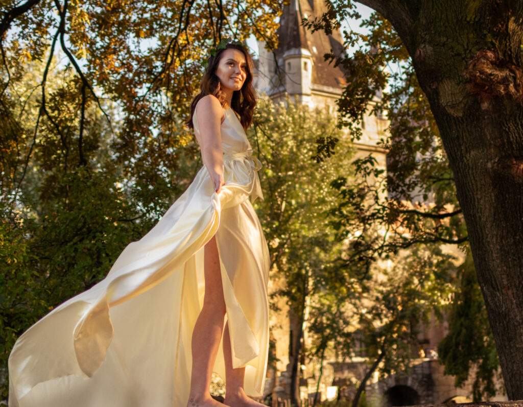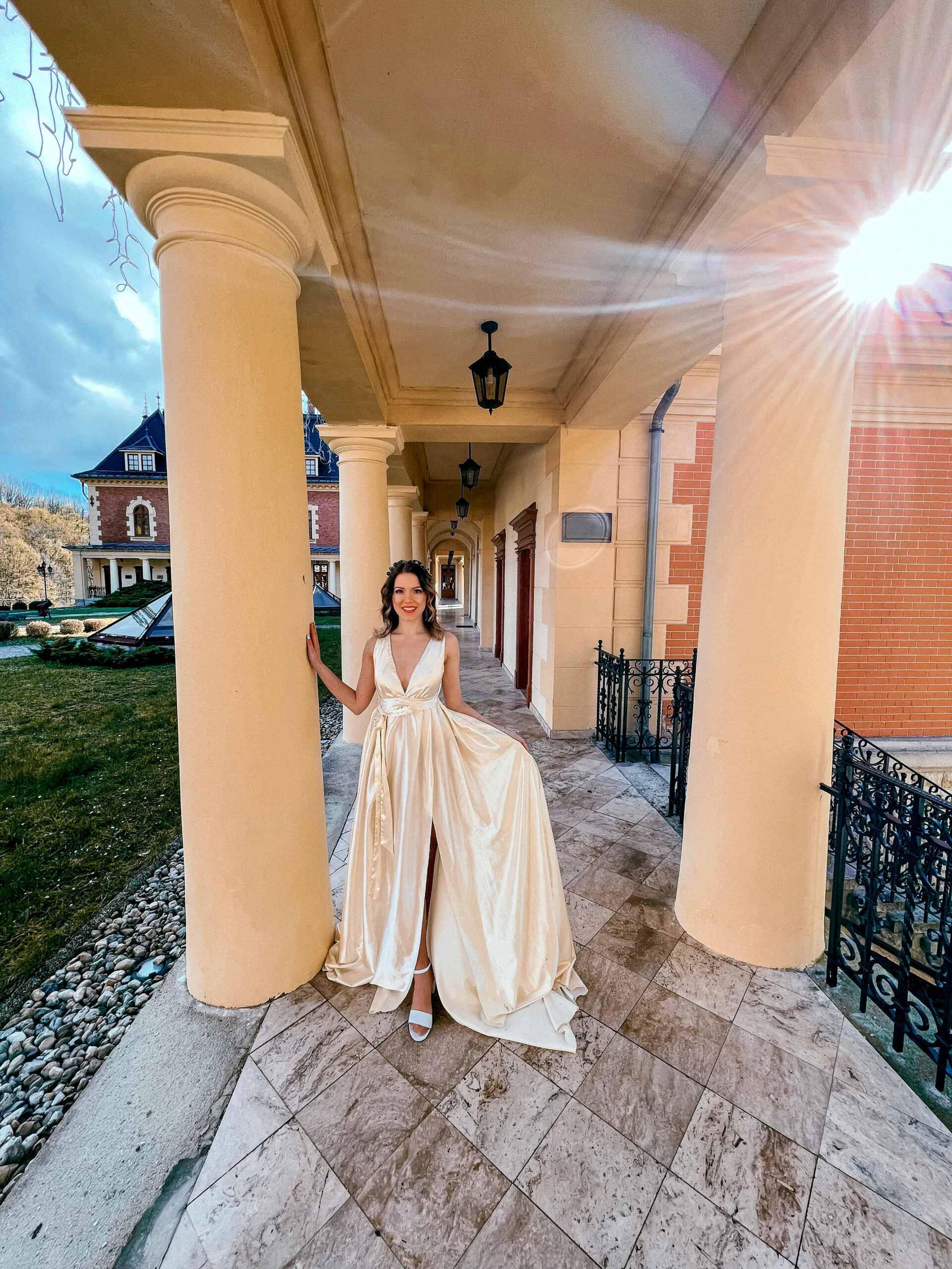A backless satin dress with a deep V-neckline and gathered waist. Made from soft, flowing satin fabric, this dress is a favorite for dance and movement photoshoots, cherished by photographers and models alike.