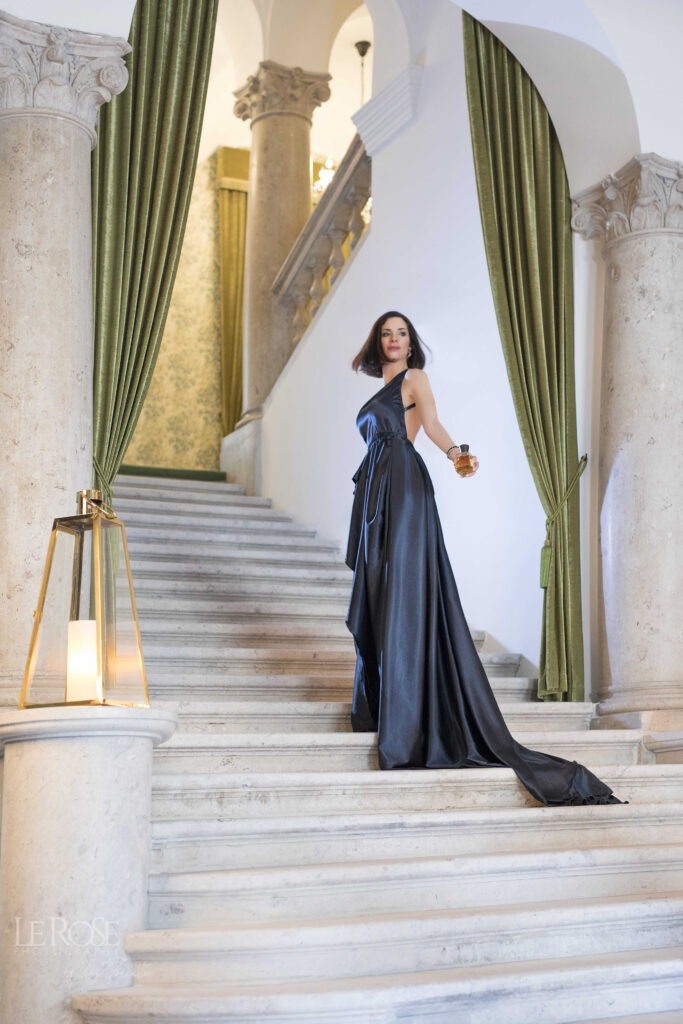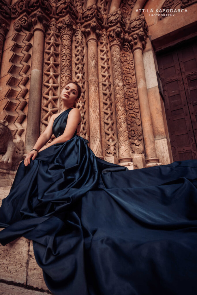 This stunning one-shoulder satin dress is the perfect choice for photoshoots, dances, or commercial films where movement and elegance blend effortlessly. The back is almost completely open, held together by delicate adjustable straps that ensure a perfect fit. An elastic waistband at the waist offers comfort and flexibility, while the adjustable waist tie adds a personalized touch. The high, ruffled slit enhances the gown’s fluid motion, bringing an airy elegance with every step or breeze. Its light, airy design allows for free movement, making it ideal for dance scenes and dynamic photoshoots.