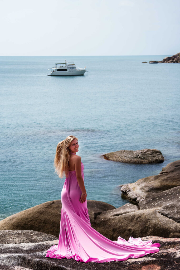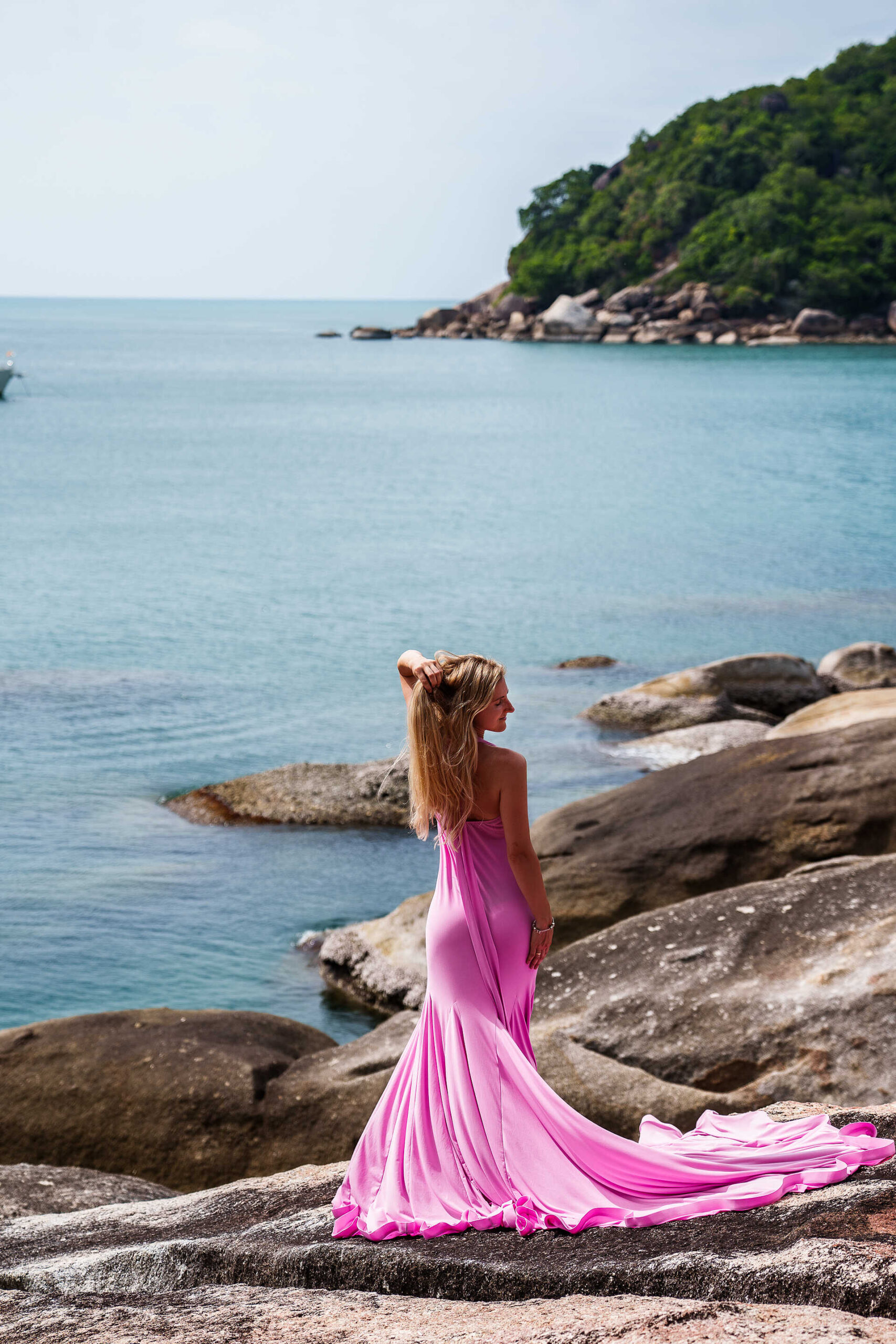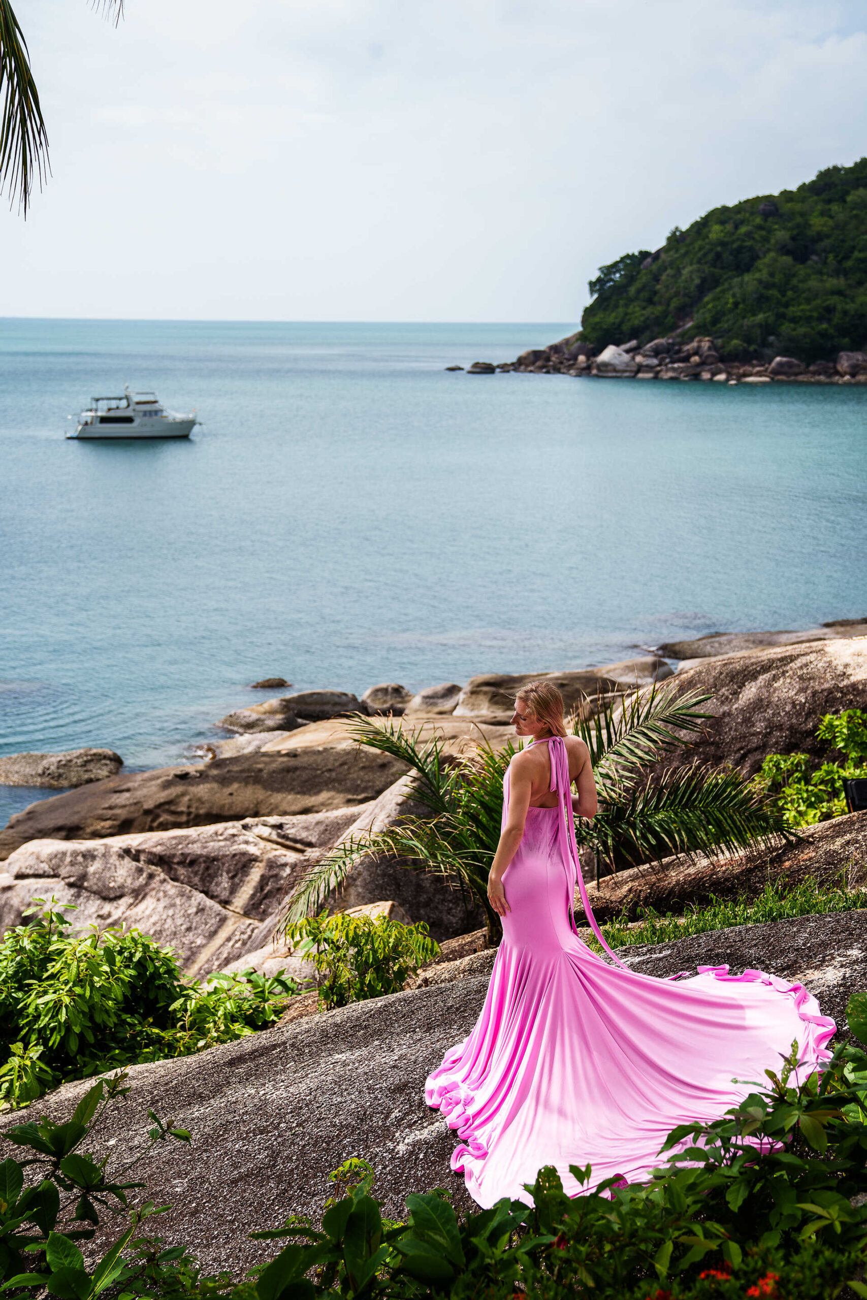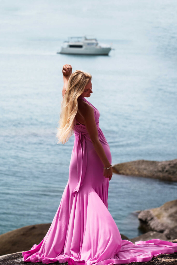 This form-fitting dress, made from stretchy fabric, is ideal for both maternity and regular photoshoots. The long tie at the top can be wrapped around the bust to secure the dress, adding a functional yet stylish detail. Its deep neckline creates a sophisticated and alluring look, while the skirt gently flares below the hips with inset panels, finished with a wavy hemline that enhances the dress’s flowing movement. Perfect for photoshoots, this gown not only provides comfort but also delivers a visually striking, feminine silhouette that captivates in motion.