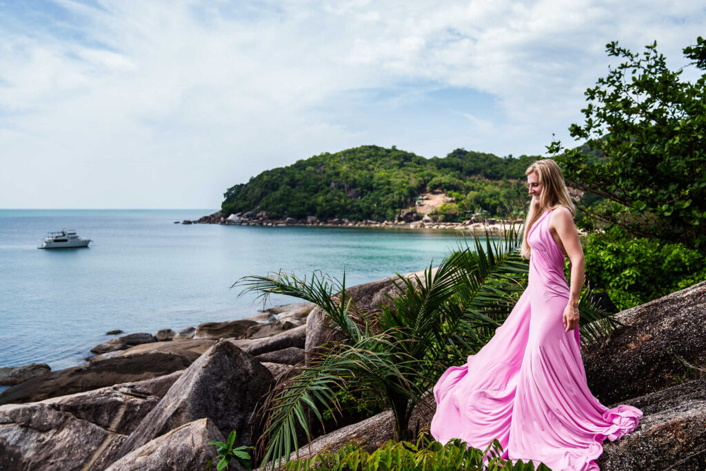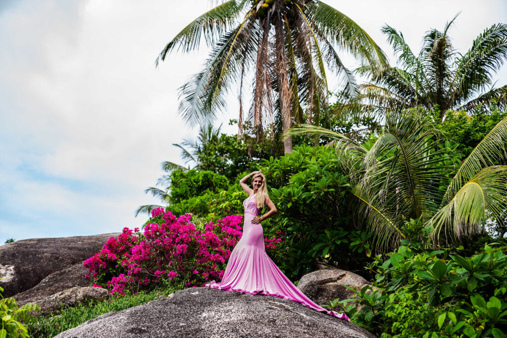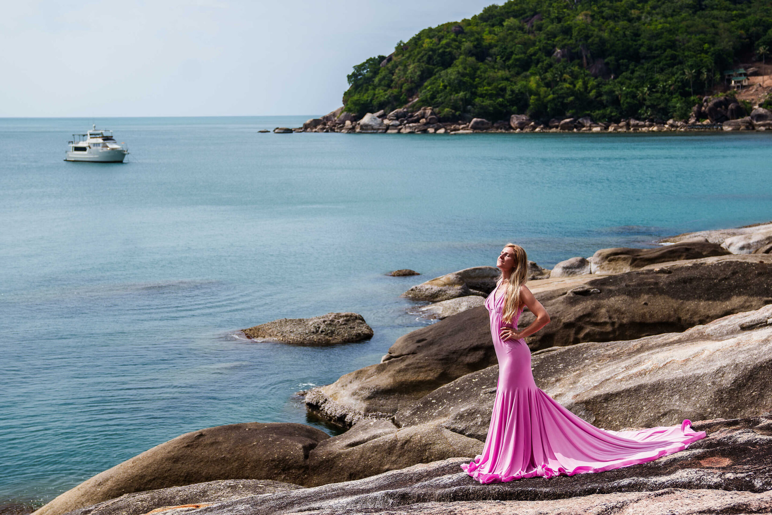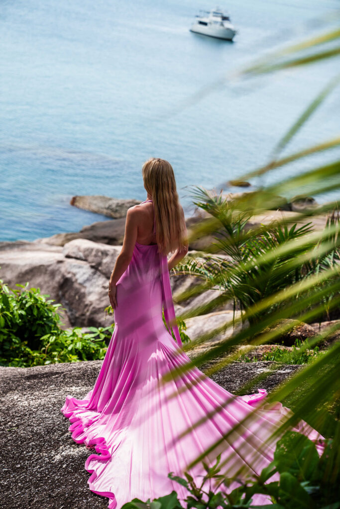 This form-fitting dress, made from stretchy fabric, is ideal for both maternity and regular photoshoots. The long tie at the top can be wrapped around the bust to secure the dress, adding a functional yet stylish detail. Its deep neckline creates a sophisticated and alluring look, while the skirt gently flares below the hips with inset panels, finished with a wavy hemline that enhances the dress’s flowing movement. Perfect for photoshoots, this gown not only provides comfort but also delivers a visually striking, feminine silhouette that captivates in motion.