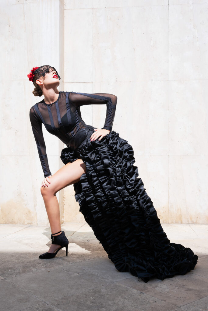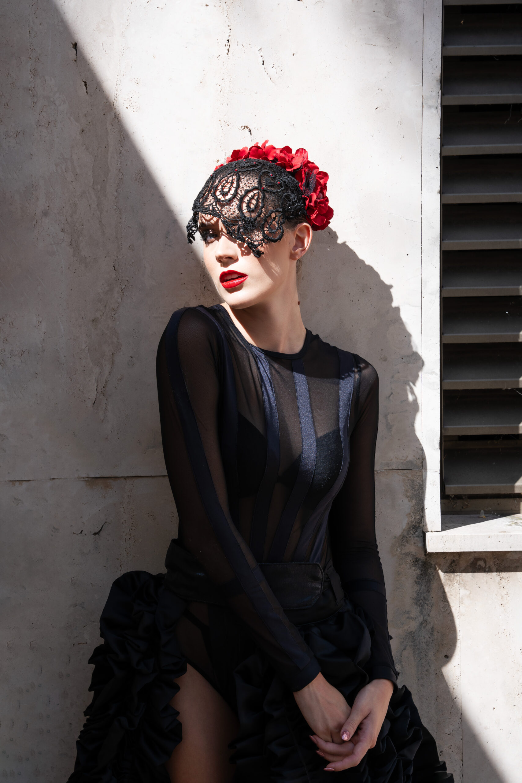 This striped net bodysuit is made from flexible material, featuring a hidden zipper closure at the back. The bodysuit elegantly hugs the body, accentuating the model’s figure. The set includes a voluminous ruffled skirt that perfectly complements the outfit. The skirt is secured with a tie made from the same material, allowing it to be adjusted to any size. This outfit provides a unique and extravagant look for photoshoots, ensuring the wearer stands out.